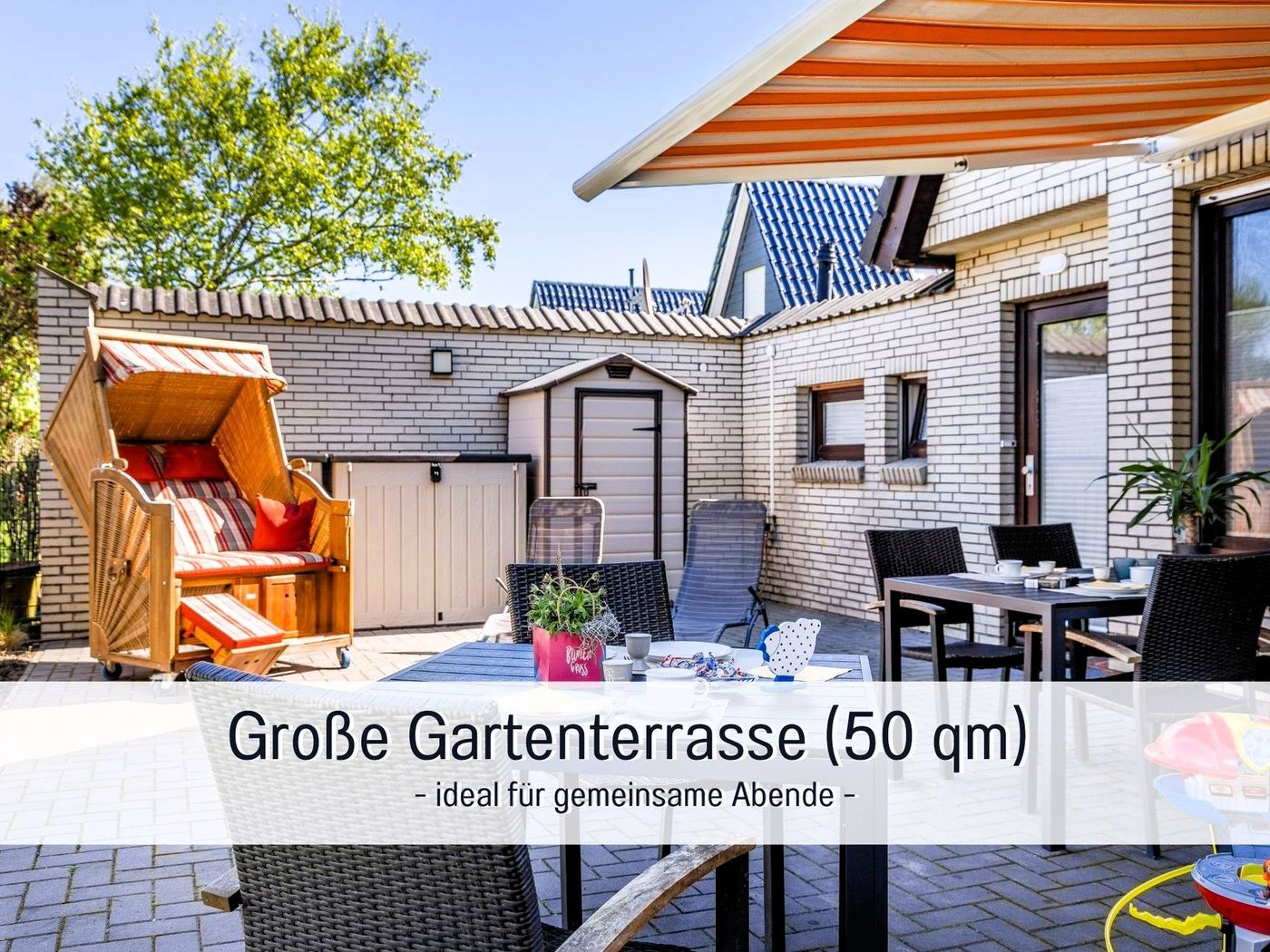 Der große Garten mit privatem Strandbereich, drei Terrassen und die unmittelbare Nähe zu Hafen und Strand machen Deinen Aufenthalt besonders entspannt.
