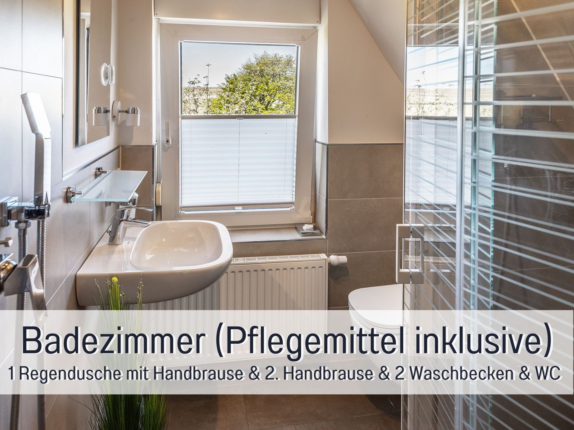 - Bad mit Regendusche, zwei Handduschen, Doppelwaschbecken & Pflegeprodukten